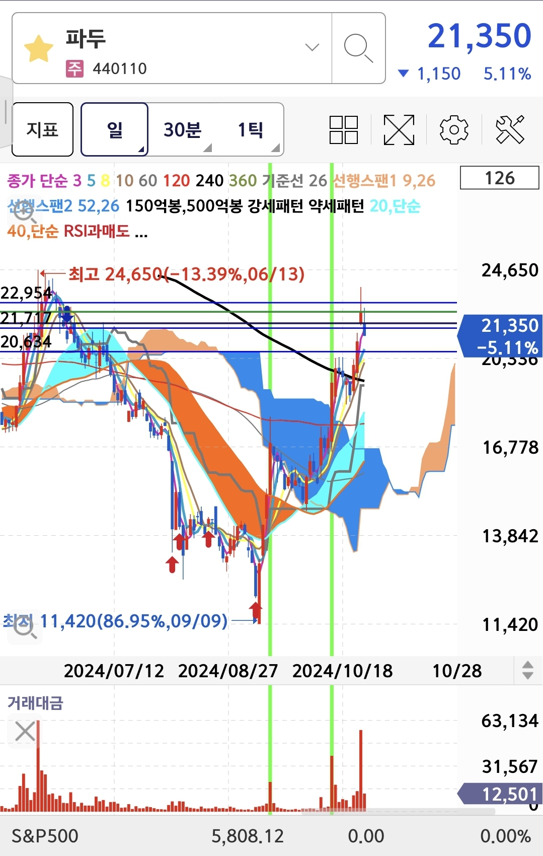 - 3분기 실적 좋게 나오고 매수 리포트 나오자마자 급락, 재료 소멸?, 지지선부근에 자동매수 걸어놓은거 매수됨, 분할매수로 접근하기로 했으니깐 계속 지켜보기, 하락 후 매수세 붙었음 추후 관찰