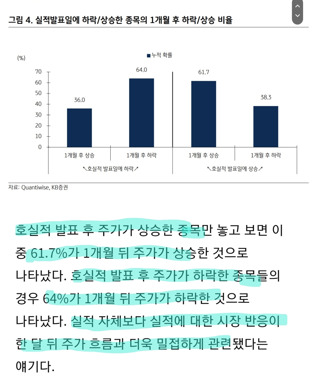 호실적 발표한 후 당일 시장반응이 향후 주가 방향에 영향미침, 호실적 발표당일 주가가 조금이라도 오른다면 향후 상승확률이 높고, 하락한다면 향후 주가도 빠질가능성이 더 높음