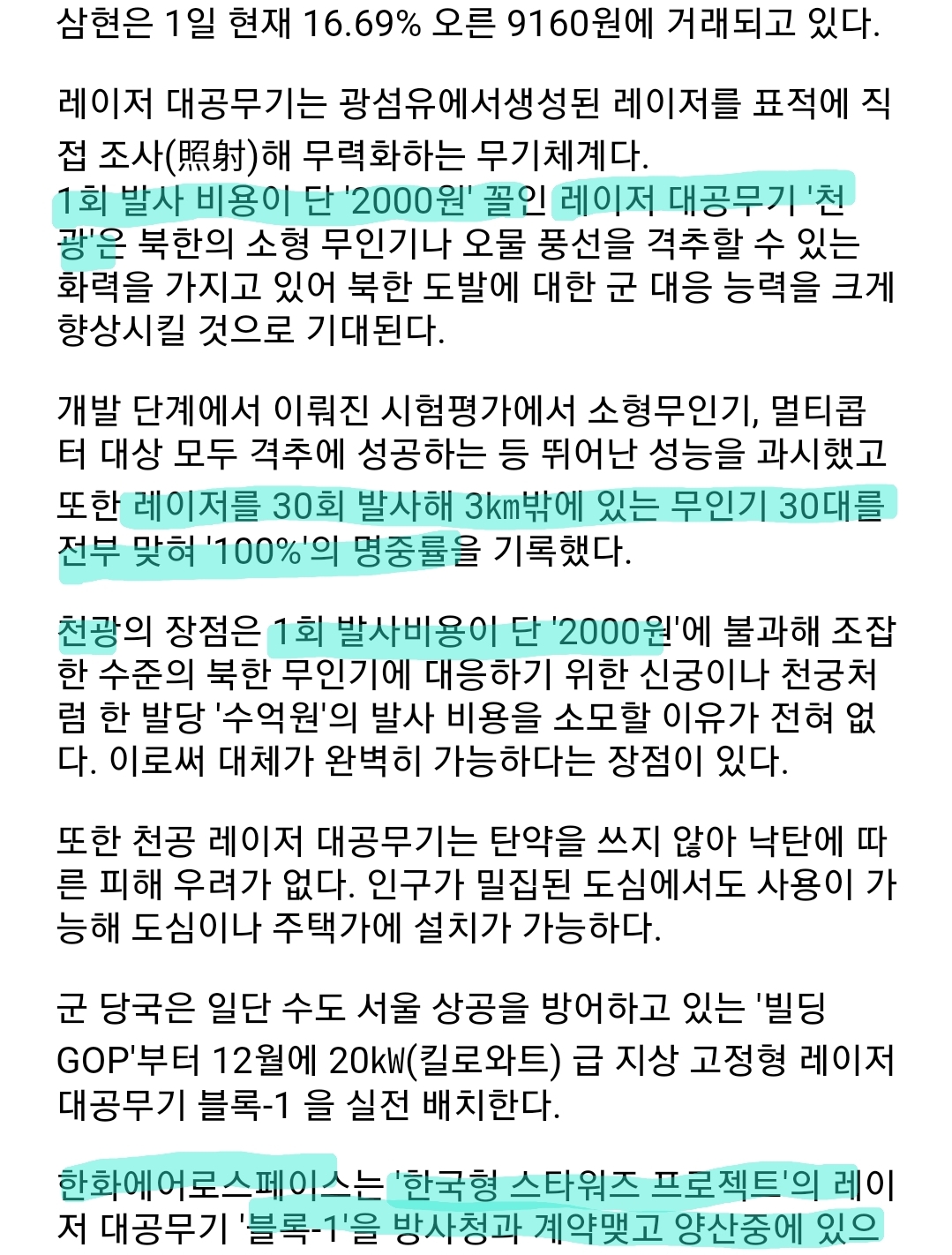 재료 : 세계최초 레이저 무기 실전배치 생산기업(좋음)