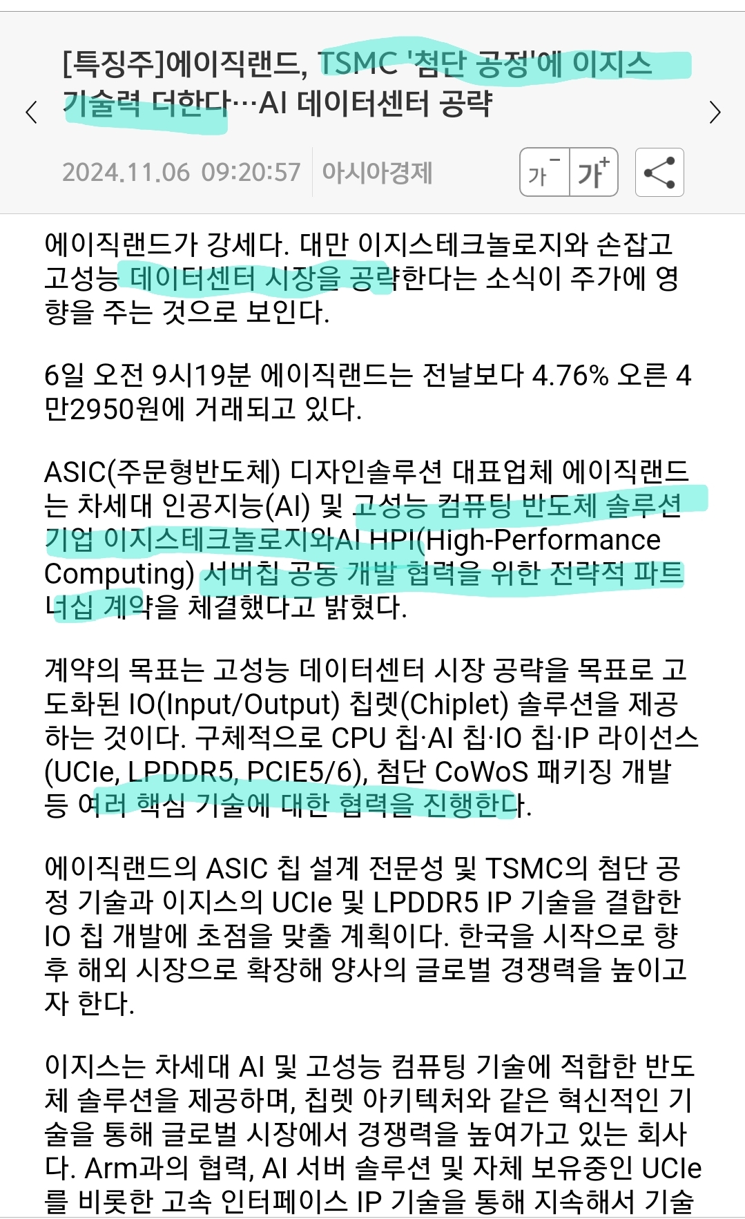 재료 : AI 국내유일 tsmc납품, + sk하이닉스 거래(유지)