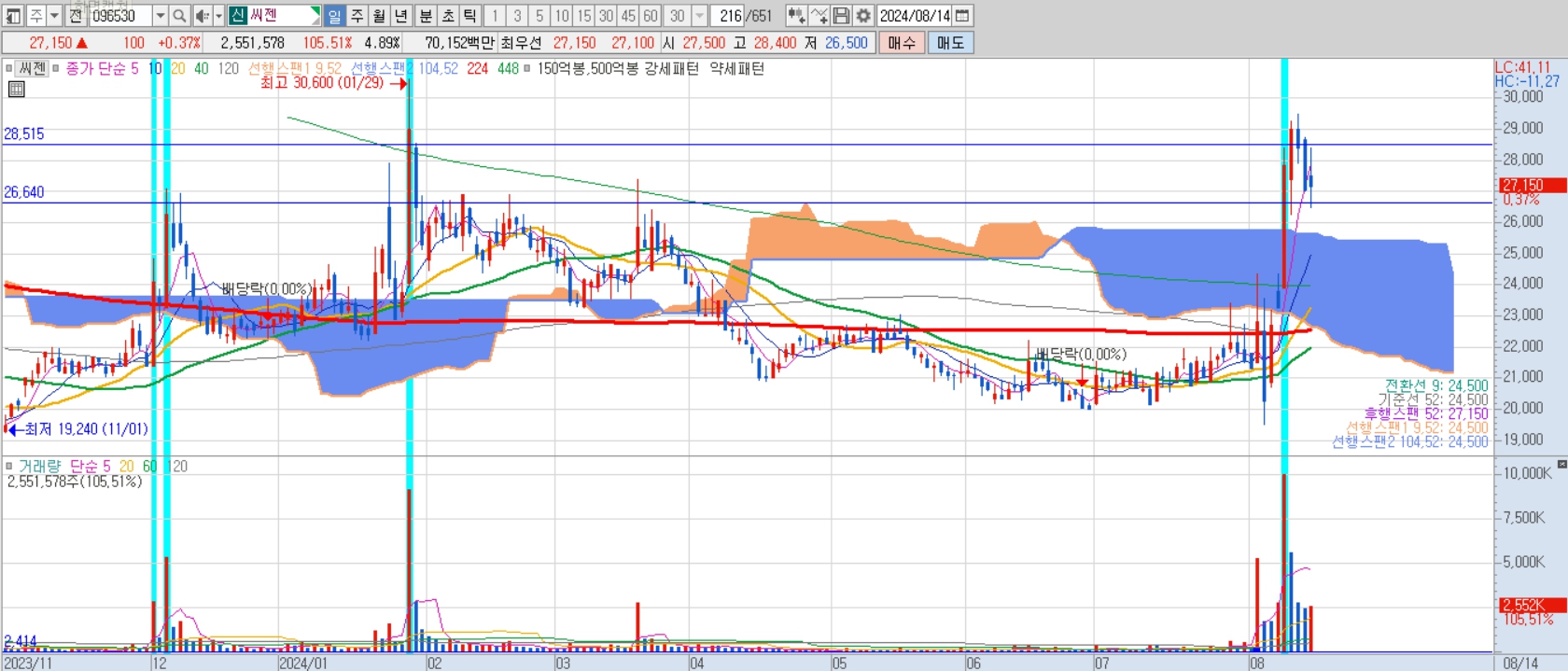 | 시나리오 | 3분할로 매수, 추세이탈 손절, 저항선 80%매도 |