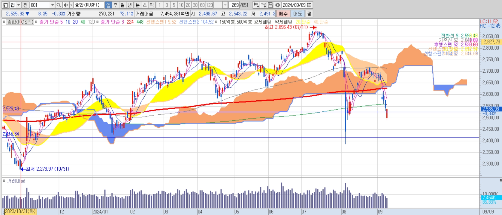 코스피 : 0.49 하락(거래대금 8.4조)