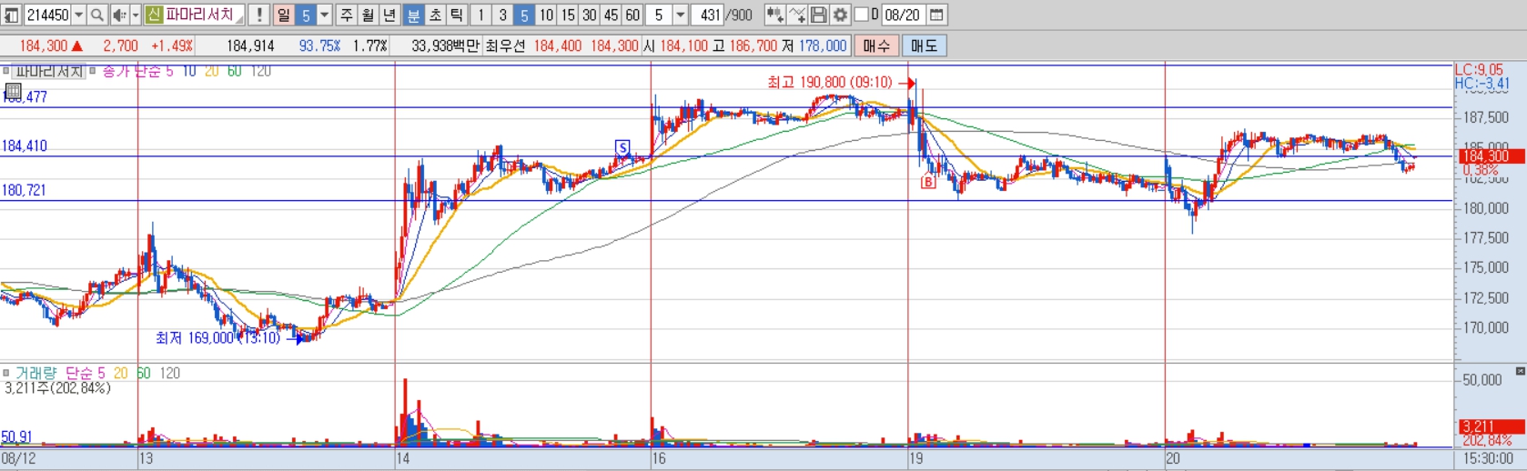 | 비고 | 장 중반 급등했으나 하락 후 장막판 지지선 지지 마감 |